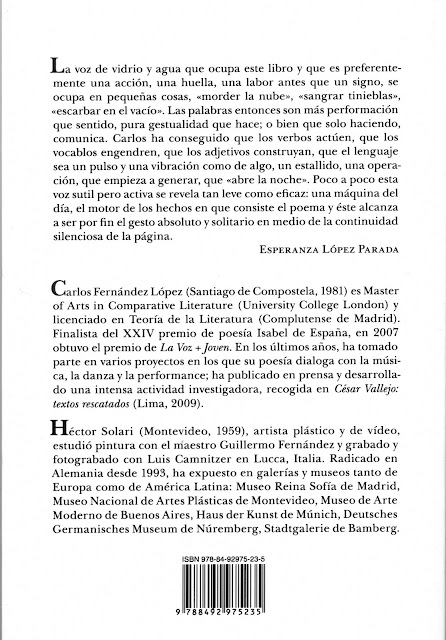 Carlos Fernández López ( Santiago de Compostela, 1981 ) est master en littérature comparée ( University College London ) et il est diplômé en théorie littéraire ( Complutense de Madrid ). Il est finaliste du XXIV prix de la poésie Isabel d'Espagne, en 2007 il a eu le prix de La Voix + Jeune. Ces dernières années il a participé à de plusieurs projets dans lesquels sa poésie parle avec la musique, la danse et la performance; il a publié des articles et il a développé une intense activité de recherche, que l'on trouve chez Cesar Vallejo : textes sauvés ( Lima, 2009 ).